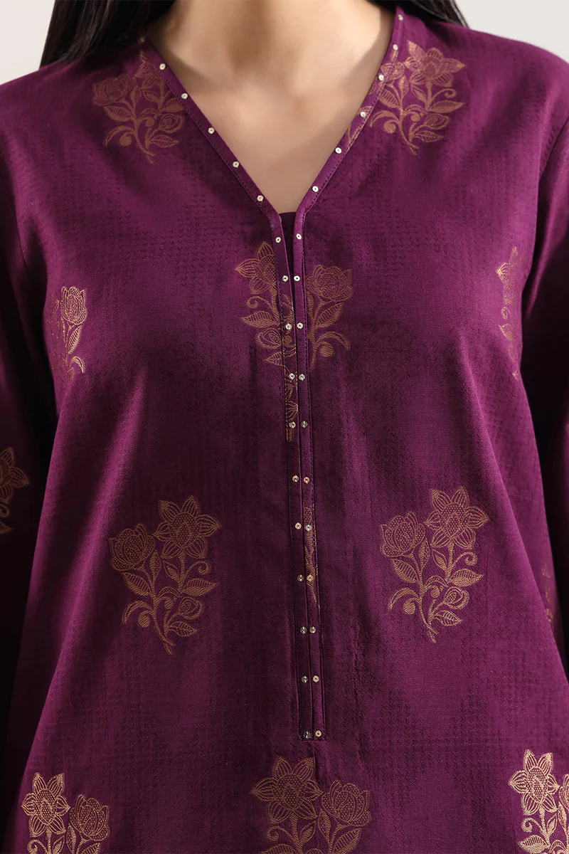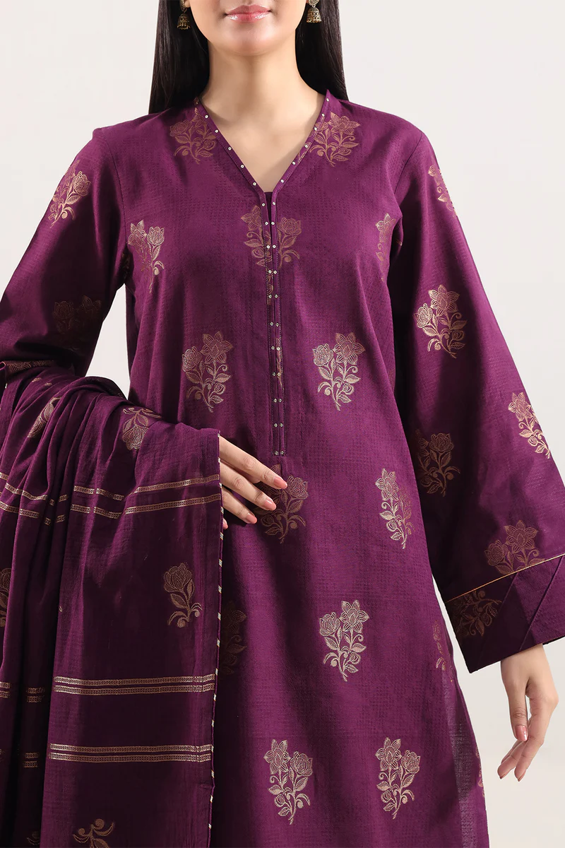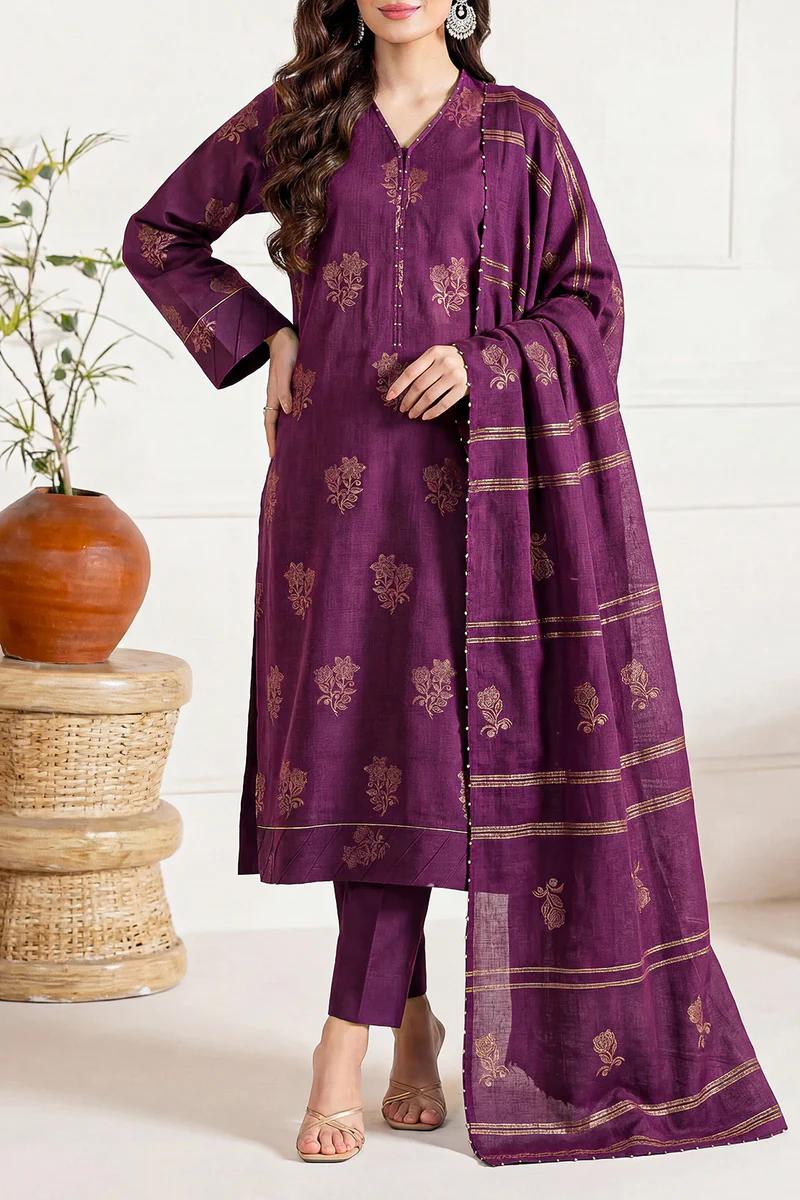The Velure Fabrics unstitched jacquard cotton 3-piece is woven from finely crafted cotton jacquard, featuring a rich self-textured pattern that brings subtle depth and refined visual character. The set includes shirt fabric, a matching trouser cloth, and a perfectly coordinated dupatta—offering complete tailoring freedom, breathable comfort, and polished versatility. Ideal for semi-formal gatherings, festive moments, and elevated everyday wear.